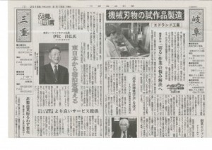 メッセナゴヤ2016出展に際し、 中部経済新聞から取材を受けました。 私の拙い説明にも関わらず、 見事な分かりやすい記事にして頂けました。 以下掲載本文 機械刃物の試作品製造 エドランド工業 …