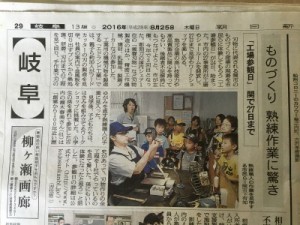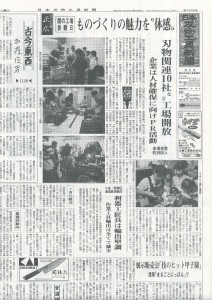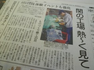 工場参観日の告知記事で、当社が取材を受けました。 当社の市原さんのバフ作業がカラーで記事になりました。 以下掲載本文 関の工場熱~く見て 体験イベントも強化 将来、関市で働く若い世代を増やそう…